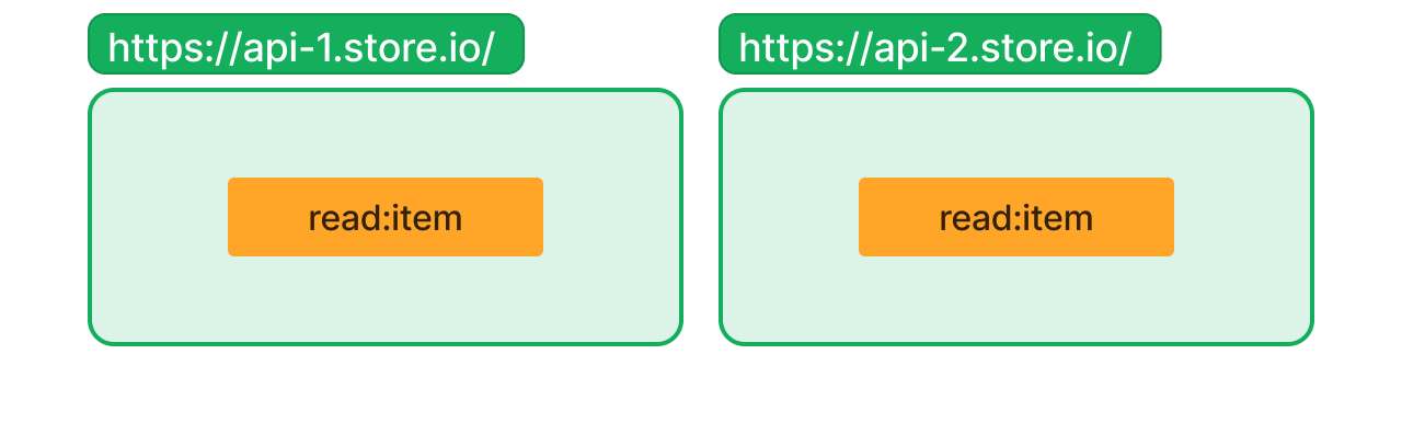 Die obige Abbildung zeigt, dass die Berechtigung read:item in der Ressource https://api-1.store.io sich von der Berechtigung read:item in der Ressource https://api-2.store.io unterscheidet.