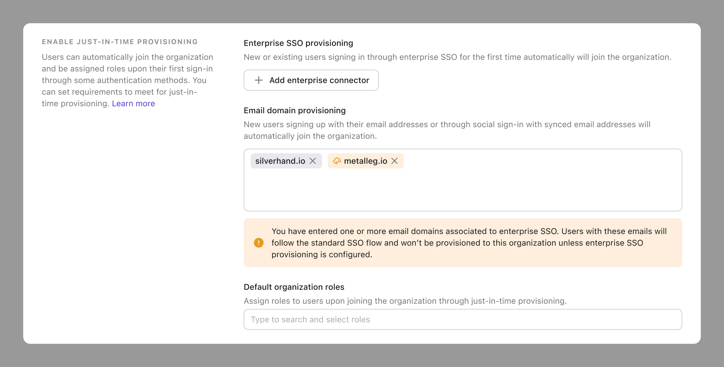 Par exemple, si vous activez l'approvisionnement par domaine de messagerie pour un utilisateur existant et souhaitez ensuite intégrer un autre groupe d'utilisateurs avec un rôle différent, l'utilisateur précédemment intégré devrait-il se voir attribuer le nouveau rôle que vous avez configuré ? Cela crée un scénario complexe pour les "mises à jour just-in-time". Le comportement exact dépend souvent de la façon dont l'application et l'intégration IdP sont configurées. Nous vous donnons ce contrôle, vous permettant de concevoir librement votre système d'approvisionnement et de gérer les scénarios les plus fréquents pour la création de nouveaux comptes et l'intégration d'organisations.