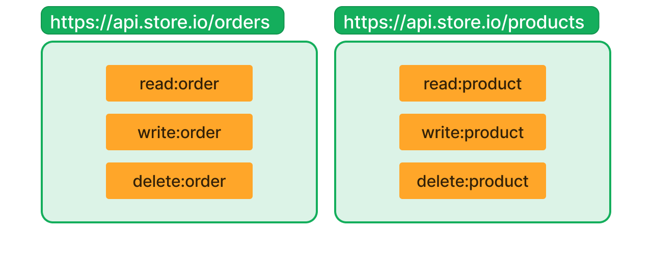 A figura acima mostra que a permissão read:item no recurso https://api-1.store.io é diferente da permissão read:item no recurso https://api-2.store.io.