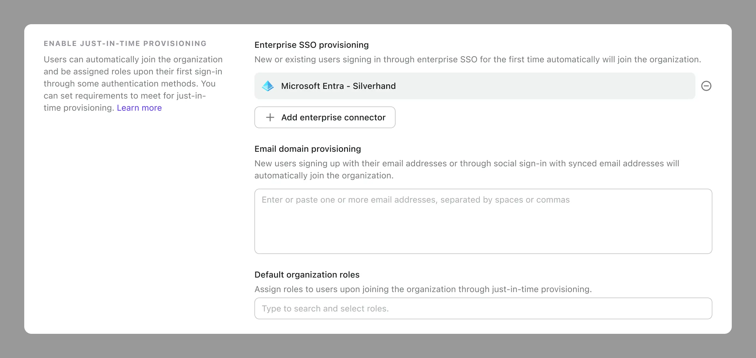 例如,如果你为现有用户启用了电子邮件域供应,并且后来想要以不同的角色入驻另一组用户,之前入驻的用户是否应该被分配你设置的新角色?这为“即时更新”创建了一个复杂的场景。确切的行为通常取决于应用程序和 IdP 集成的配置。我们将此控制权交给你,让你可以自由设计你的供应系统,并处理新账户创建和组织入驻的最常见场景。